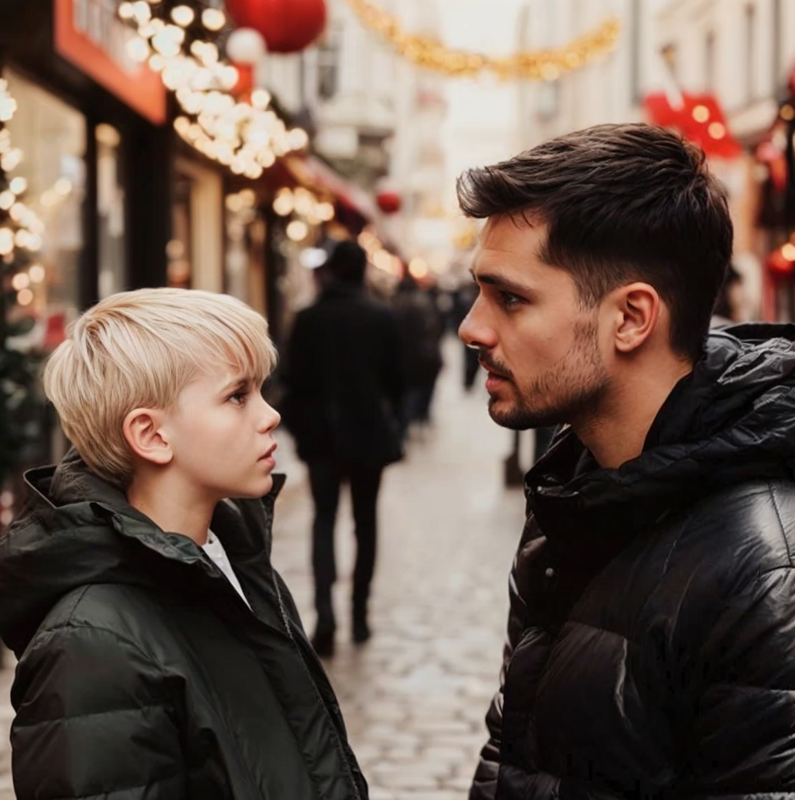 Lorsque le Noël suivant arriva, tout avait changé. Sarah et moi étions maintenant mariés, et Ben était officiellement notre fils. Cette veille de Noël, nous retournâmes sur la place, tous les trois main dans la main, entourés de rires et de lumières.