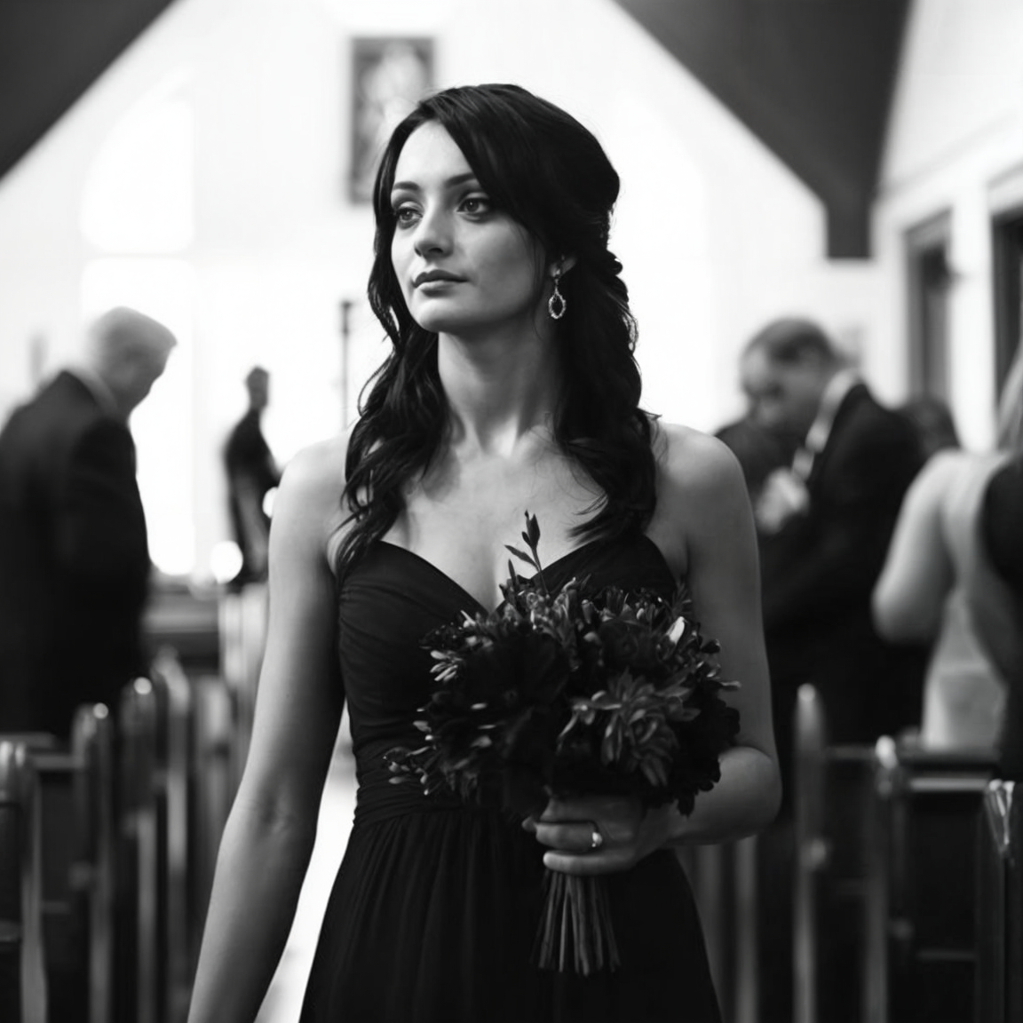 Jane marcha lentement, sa traîne noire balayant les pétales blancs éparpillés le long de l’allée. Son voile, léger et sombre, encadrait son visage, mais je pouvais encore distinguer son expression calme.